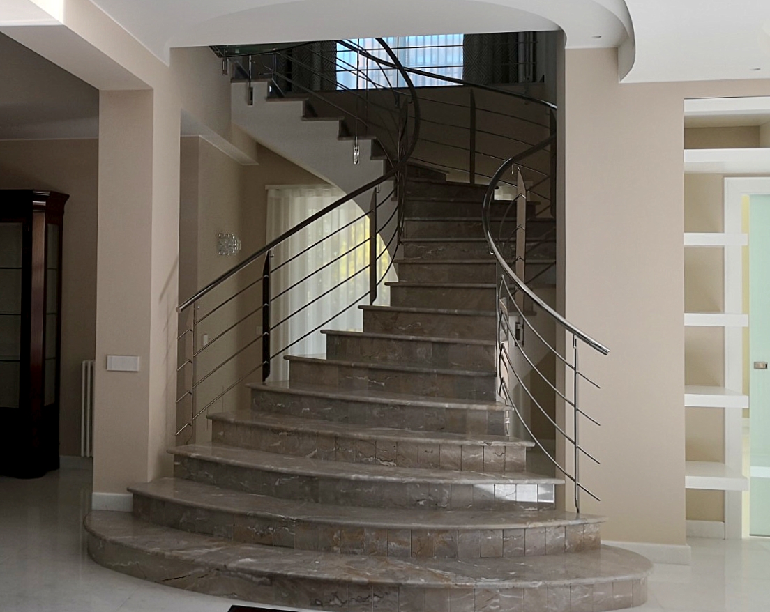 Parapetto in acciaio inox lucido per scala a giorno elicoidale, ideale per valorizzare il salone mantenendo alti standard di sicurezza ed estetica